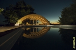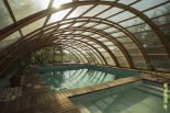 A ház nyugati oldalán, a medence partján a 40 m2-es, fedett, nyitott terasz - egyben a télikert -, lehetőséget ad a kerti sütögetésre is. Az épület nyugati teraszos részén egy 5x7 méteres, 1,5 m vízmélységű úszómedence, valamint egy 3x2 méteres, 50 cm vízmélységű kismedence található. A medencék és a terasz eltolható fedéssel tehető nyitottá avagy zárttá, melynek eredményeként április 1-től október 1-ig kellemes fürdési lehetőséget biztosítanak.